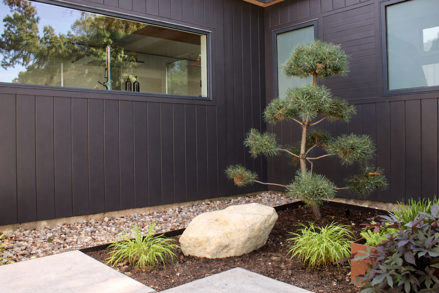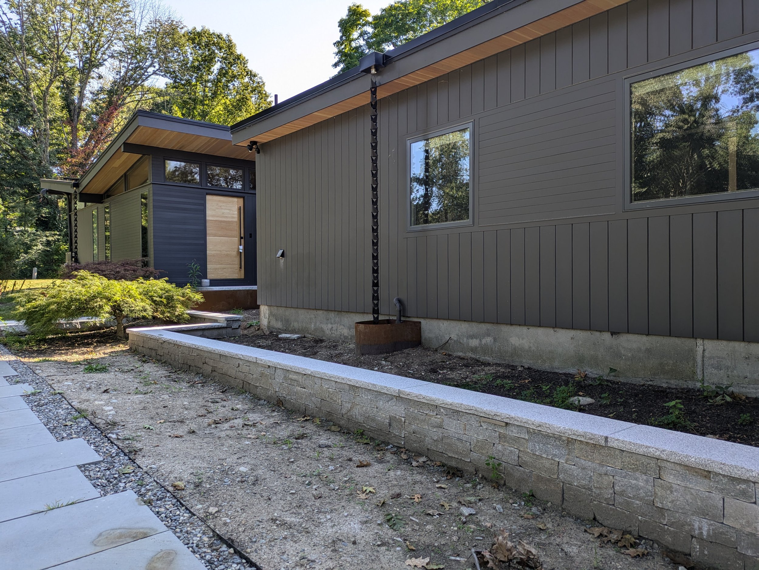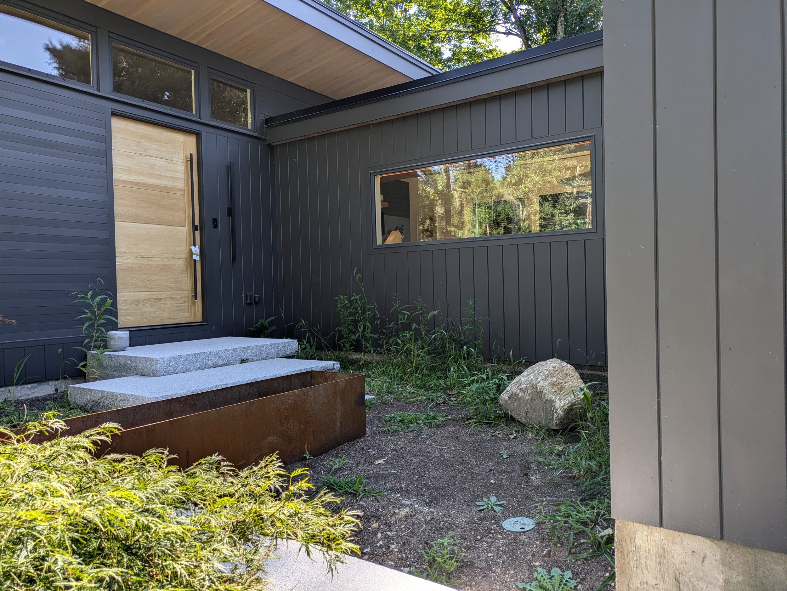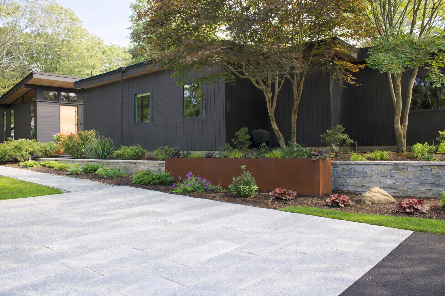 A fresh, modern landscape defined by corten steel planters, granite slap patios and layered plantings that bring texture, color and seasonal blooms.